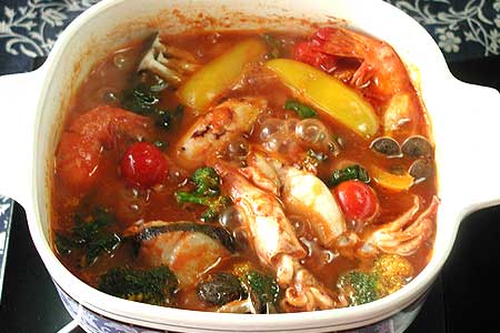 - 將切成薄片的大蒜,紅辣椒倒入鍋中,小火翻炒。加入水煮好的番茄(在鍋中把番茄煮爛)煮好后,加入已準備好的步驟1,2中的食材,翻炒出香味后,加水至鍋的4/5,撇除浮沫,煮熟后加鹽,胡椒進行調味即可。
