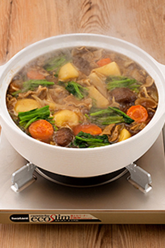 • 鍋內入高湯、洋蔥、土豆和紅蘿卜用中火煮開。煮開后放豬肉并撇去沫渣。停火一小段時間后放入弄碎的咖喱塊,全部攪拌均勻后用小火熬煮。土豆熟透后加菠菜和香菇再一次燜煮,全部熟透后即可食用。